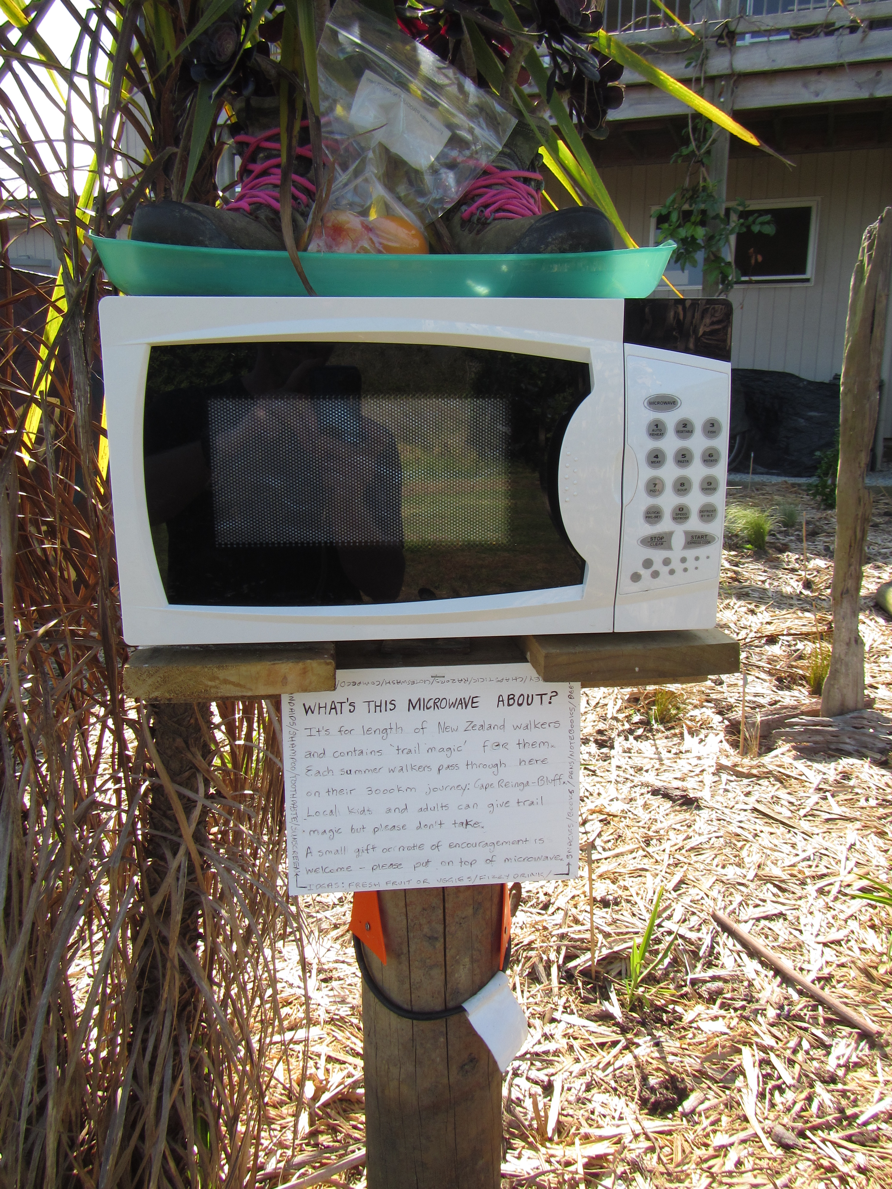 Along the way the track passed by a kauri tree so large they had to name and protect it – Tena Moana ‘the big one’. Coming out of the forest towards Ngunguru it was back to road walking. Along the way I saw a trail marker on the side of a power pole, pointing the way to towards ‘trail magic’. The trail led to a microwave oven at the back of a property offering gifts to TAers. I took an apple, sat down and just about inhailed it. Fresh fruit – yum. Juicy apple – incredible.
