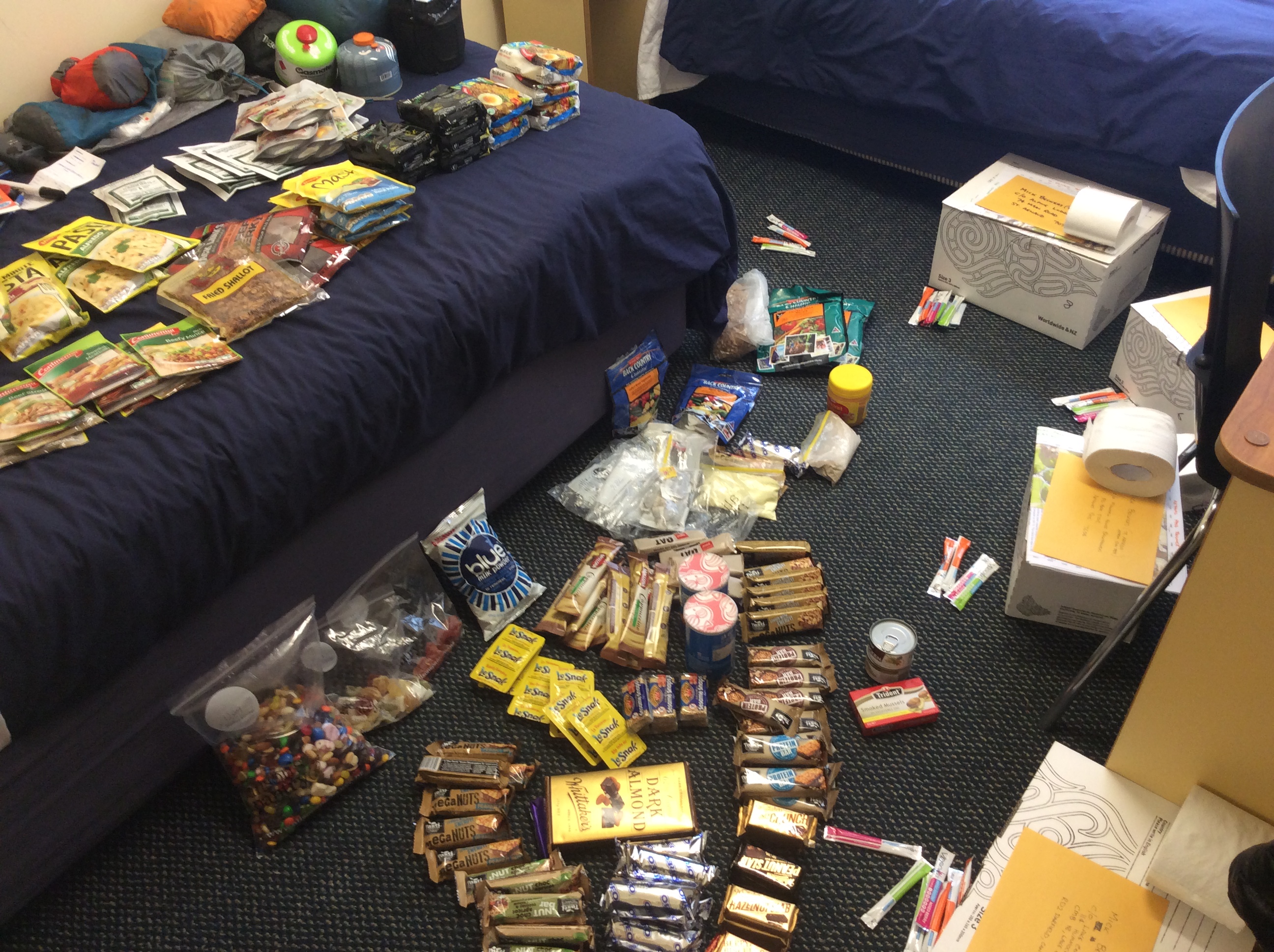 image Published January 14, 2016 at 2592 × 1936 in Day 65: Wellington Zero Day 1 My hostel room covered with food and boxes.