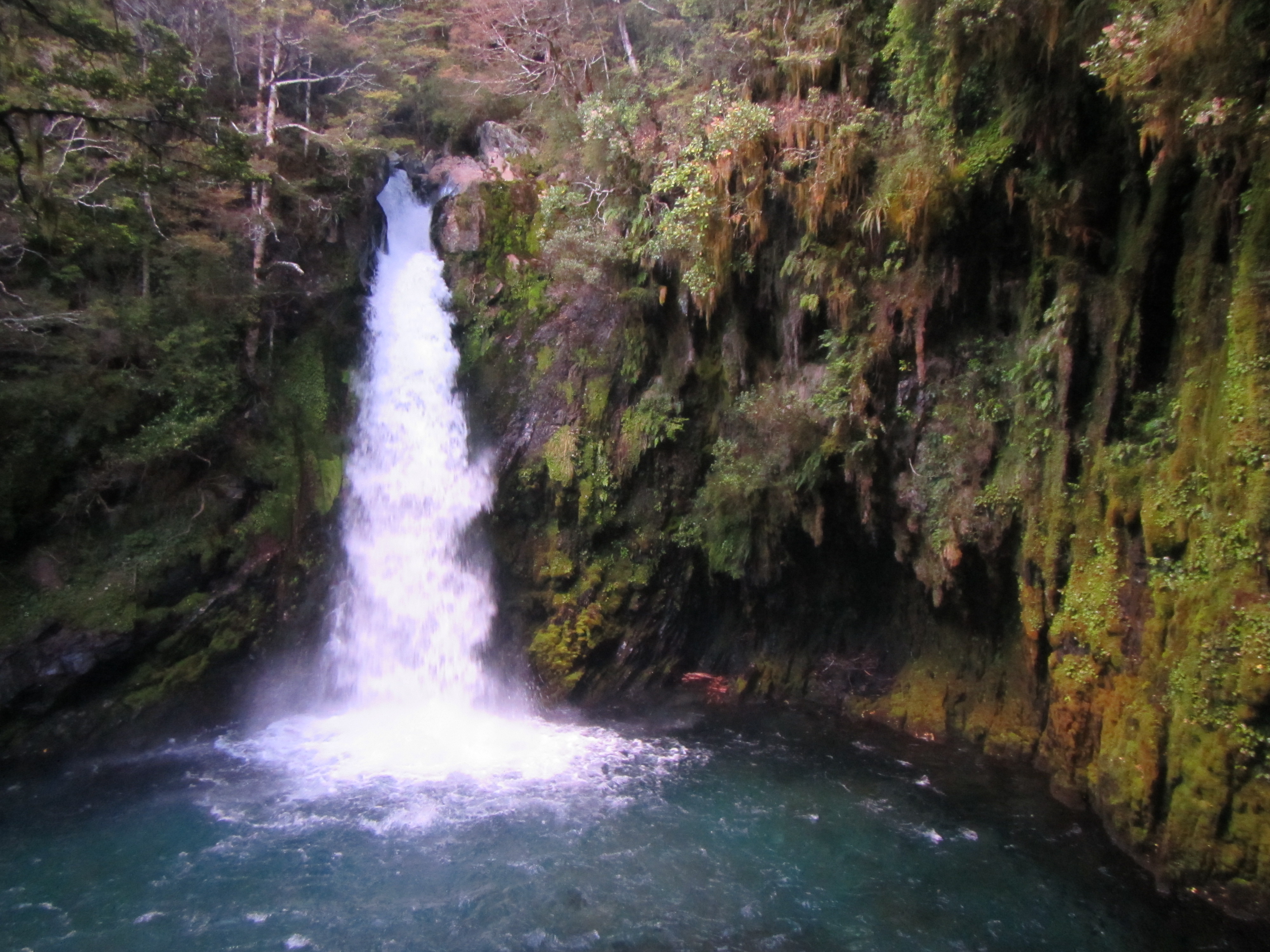 Around 40 minutes I hit the short side trail to the Travers Falls. Dropping my pack at the track junction, I followed the steep track, climbing down vertical sections of tree roots to the base of the falls. Spectacular! In a dark sided chasm the tumultuous waters of the Travers spilled down a narrow chute with boulders on either side, to a deep blue pool below. The amphitheatre of rock surrounding, bright green with moss and lichens climbing vertically yo the walls.