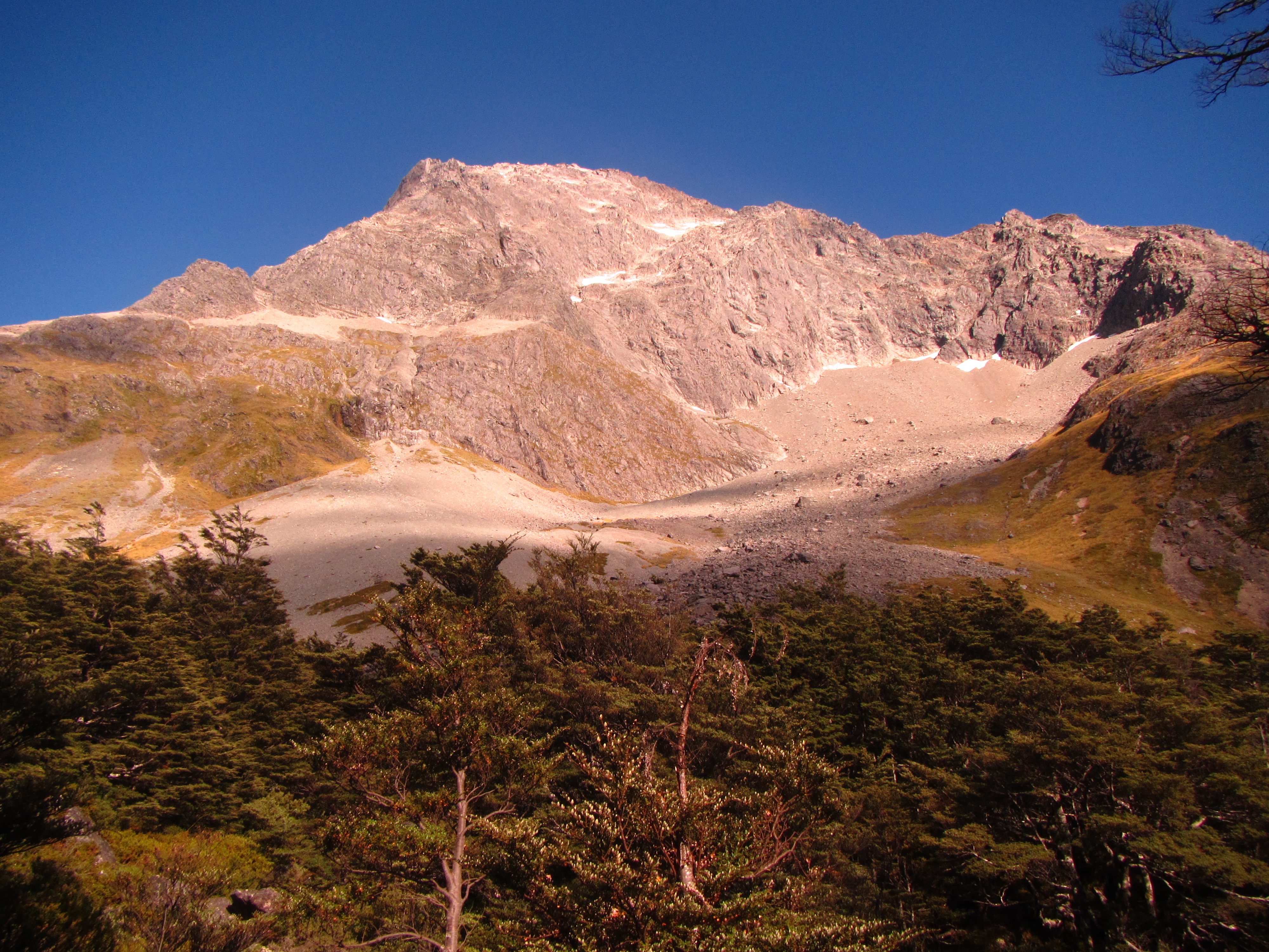 Further up the valley the first glimpses of the mountains lining the valley came into view through gaps in the trees. Talk about feeling insignificant. The eastern slopes of Mt Travers towering above at over 2000 metres. Vast slopes of bare rock and old avalanches ran down to the river with the odd water fall tumbling for more than 300m down.